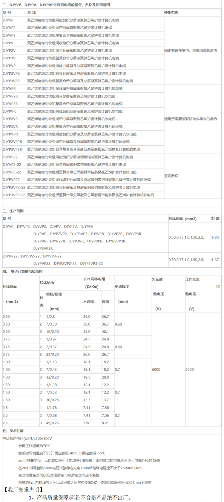 DJYVP、DJYPV、DJYPVP计算机电缆产品额定电压(U0/U):300/500V长期工作温度为70℃敷设时环境温度不低于:固定敷设-40℃,非固定敷设-15℃...