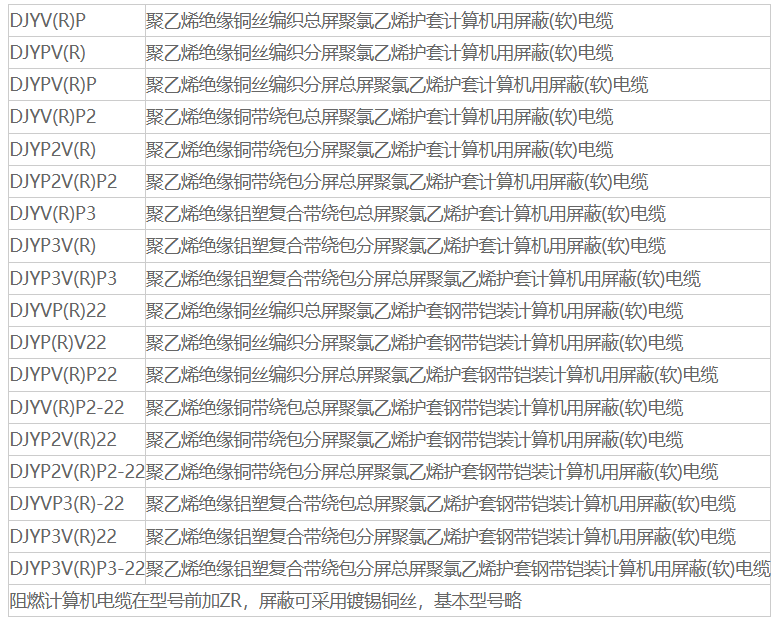 1、名称:计算机屏蔽双绞电缆 2、型号:DJYPV、DJYVP、DJYPVP、DJVVP、JVV、JVVP、DJYPRV 3、规格:1对--24对 4、计算机屏蔽双绞电缆用途:使用于抗干扰性能要求较高的电缆,也可以使用于抗干扰性能较高的检测仪器、仪表连接线用的电缆 5、简要说明:选用介电常数小的高压聚乙烯作绝缘。采用对绞、对屏、总屏(或三线组合、组屏蔽、组屏总屏)等结构形式,具有介质损耗小、传输传号能力强、抗干扰性能好等特点,能可靠地传输微弱的模拟信号,可广泛地应用于发电、冶金、石油、化工、轻纺等部门的检测和控制用计算机系统或自动化装置,以及一般的工业计算机上。 6、聚乙烯绝缘聚氯乙烯护套计算机用屏蔽电缆(包括DCS电缆)