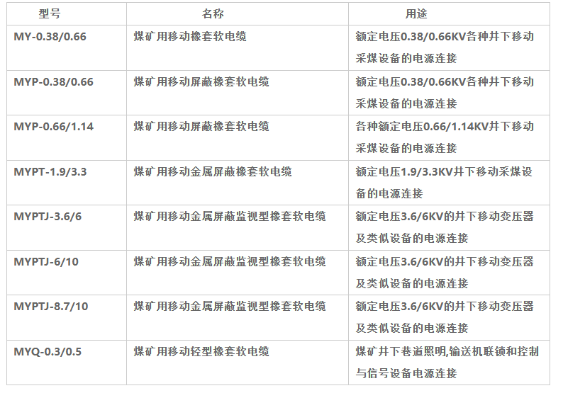 煤矿用移动橡套软电缆执行标准:MT818-2009,本产品适用于额定电压8.7/10KV及以下煤矿用橡套电缆,电缆长期工作温度