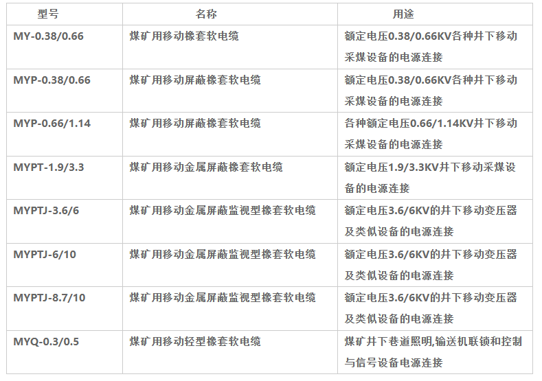 煤矿用移动橡套软电缆执行标准:MT818-2009,本产品适用于额定电压8.7/10KV及以下煤矿用橡套电缆,电缆长期工作温度90℃。