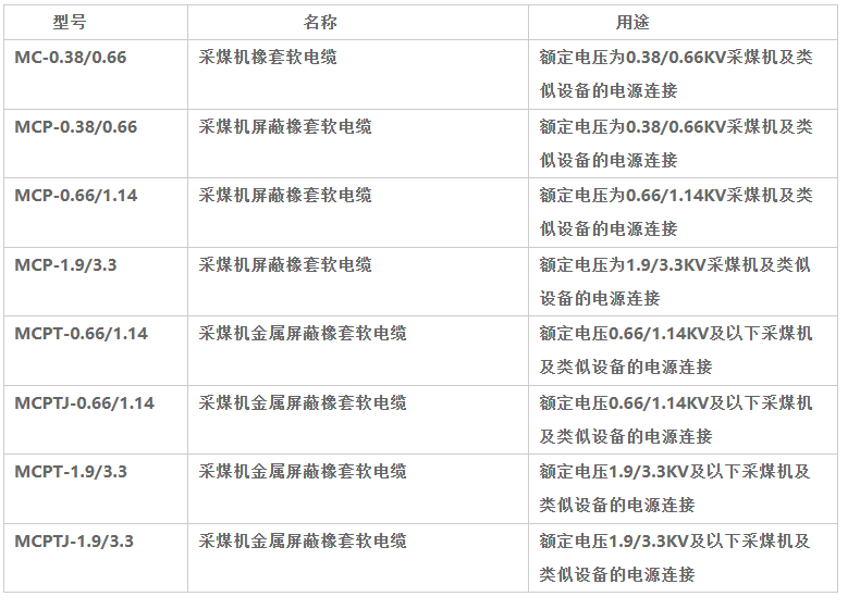 煤矿用采煤机电缆执行标准:MT818-2009,本产品适用于额定电压8.7/10KV及以下煤矿用采煤机电缆,电缆长期工作温度90℃