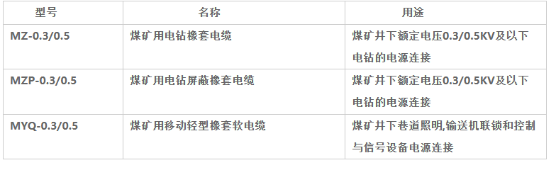 用途:本产品为矿用橡胶套软电缆系列产品之一,MZ矿用电钻电缆适用于煤矿下额定电压0.3/0.5KV及以下电钻作电源连接线。