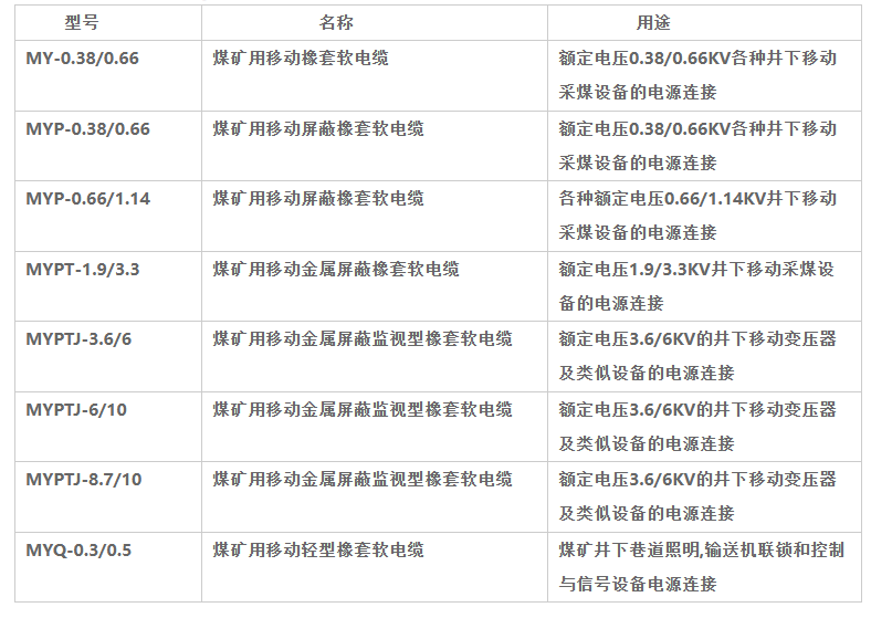 4、MYP矿用橡套电缆有3个带绝缘屏蔽的主线芯和一个包覆半导电橡皮层的地线组成,围绕半导电橡皮层垫芯绞合成缆。外面挤包黑色氯化聚乙烯橡皮护套或黑色氯丁橡皮护套。