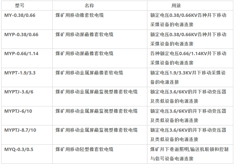4、MYP矿用橡套电缆有3个带绝缘屏蔽的主线芯和一个包覆半导电橡皮层的地线组成,围绕半导电橡皮层垫芯绞合成缆。外面挤包黑色氯化聚乙烯橡皮护套或黑色氯丁橡皮护套。