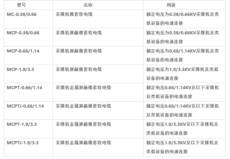 额定电压1.9/3.3KV及以下采煤机软电缆 矿用电缆执行标准:MT818-2009,本产品适用于额定电压8.7/10KV及以下煤矿用采煤机电缆,电缆长期工作温度90℃
