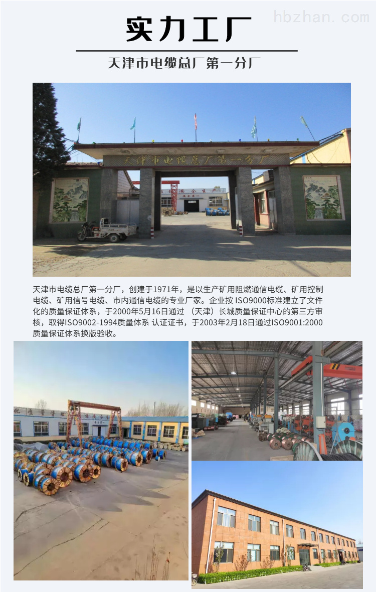 天津市电缆总厂第一分厂,创建于1971年,是以生产矿用阻燃通信电缆、矿用控制电缆、矿用信号电缆、市内通信电缆的**厂家。企业按 ISO9000标准建立了文件化的质量**体系,于2000年5月16日通过 (天津)长城质量**中心的第三方审核,取得ISO9002-1994质量体系 认证证书,于2003年2月18日通过ISO9001:2000质量**体系换版验收。 矿用通信电缆、信号电缆MHYAV、MHYA32、MHTV、MHY32、MHYVP等矿用控制 电缆MKVV、MKVV22、MKVV32等均获得煤矿产品安全标志证书。 该厂以"质量*,用户至上,**服务,信守合同"为宗旨,给矿山开采一个安全的**。