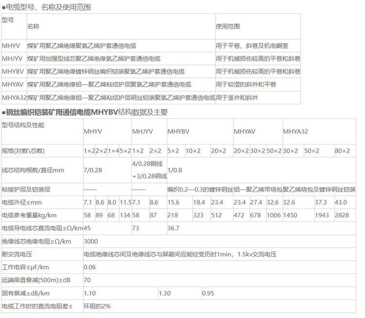 钢丝编织铠装矿用通信电缆MHYBV使用条件 ●环境温度:-40~50℃ ●月平均相对温度:95%(+25℃) ●安装敷设环境温度:≥-10℃ ●安装时弯曲半径:MHYBV、MHJYV为电缆外径的10倍,其他型号为电缆外径的15倍 ●电缆型号、名称及使用范围