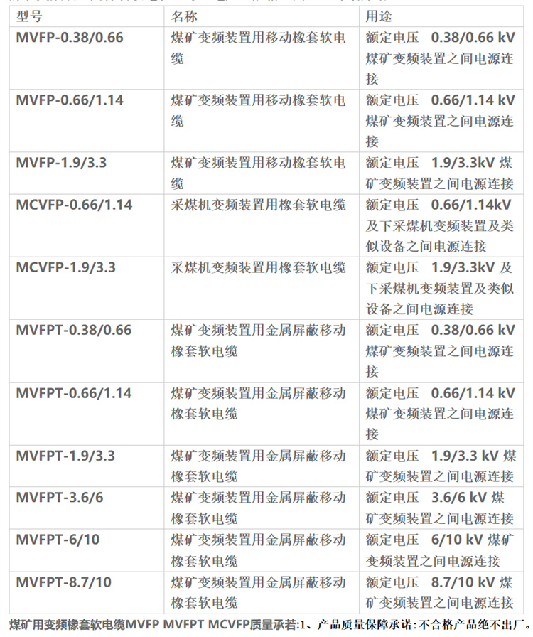 煤矿用变频橡套软电缆MVFP MVFPT MCVFP适用于额定电压8.7/10kV及以下煤矿变频装置用橡套软电缆、采煤机变频装置用橡套软电缆。 煤矿变频装置用橡套软电缆型号、电压、规格、用途、详细介绍: