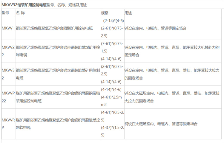 MKVV32铠装矿用控制电缆**标准:MT386-1995 Q/TY1003-2007 Q/TY1003-2009《煤矿聚氯乙烯绝缘聚氯乙烯护套阻燃控制电缆》 1、额定电压450/750v 2、电缆导体的长度允许工作温度为70摄氏度 3、电缆的敷设温度应不低于0摄氏度,推荐的允许弯曲半径; 4、无铠装层的电缆,应不小于电缆外径的6倍 5、有铠装或铜带屏蔽结构的电缆,应不小于电缆外径的12倍。 6、有屏蔽结构的软电缆,应不小于电缆外径的6倍。