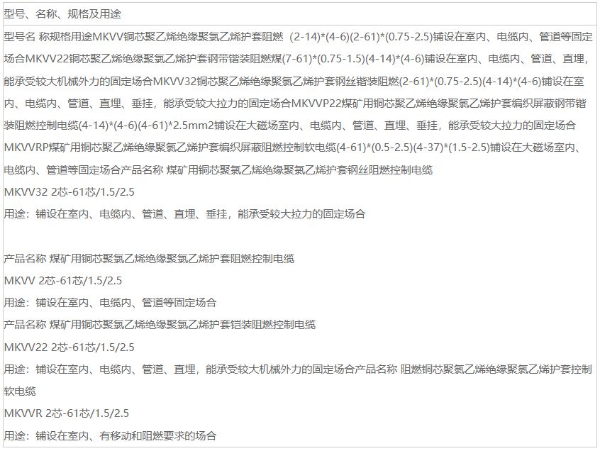 产品名称: MKVVR电缆价格型号规格煤矿用铜芯聚氯乙烯绝缘聚氯乙烯护套阻燃控制电缆 矿用控制电缆**标准:MKVVR电缆价格型号规格MT386-1995 Q/TY1003-2009《煤矿聚氯乙烯绝缘聚氯乙烯护套阻燃控制电缆》 1、矿用控制电缆额定电压450/750v 2、电缆导体的长度允温度为70摄氏 3、电缆的敷设温度应不低于0摄氏度,推荐的允许弯曲半径; 4、无铠装层的电缆,应不小于电缆外径的6倍 5、有铠装或铜带屏蔽结构的电缆,应不小于电缆外径的12倍。 6、有屏蔽结构的软电缆,应不小于电缆外径的6倍。