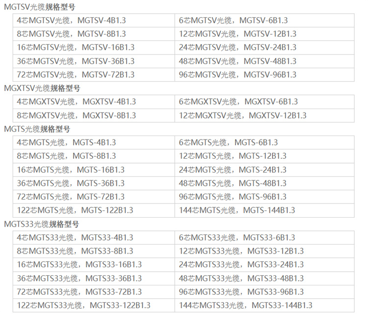 MGTSV矿用阻燃光缆适用于矿用通信及监控用光缆。 MGTSV矿用阻燃光缆执行标准MT/T 386-2011 Q/TY1009-2020 煤矿用通信光缆型号及其名称 MGTS:金属加强构件、松套层绞填充式、钢—聚乙烯粘结护层、阻燃聚烯烃外护套煤矿用通信光缆。 MGTSV:金属加强构件、松套层绞填充式、钢—聚乙烯粘结护层、阻燃聚氯乙烯外护套煤矿用通信光缆。 MGXTSV:中心管填充式、金属加强构件、钢—聚乙烯粘结护层、阻燃聚氯乙烯护套煤矿用通信光缆 MGTS33:煤矿用金属加强构件、松套层绞填充式、钢-聚乙烯粘结护套、钢丝铠装、阻燃聚烯烃护套通信光缆