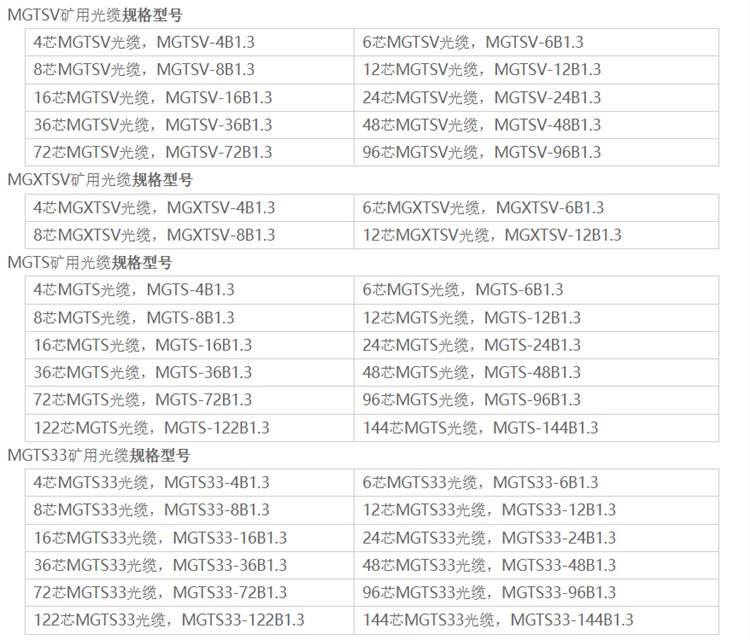 MGTS矿用阻燃光缆是将单模或者多模光纤套入高模量材料制成的松套管中,松套管内填充防水化合物。缆芯的中心是一根金属加强芯,对于某些芯数的光缆来说,金属加强芯外还需挤上一层聚乙烯(PE)。松套管(和填充绳)围绕中心加强芯绞合成紧凑和圆形的缆芯,缆芯内的缝隙充以阻水填充物。MGTS矿用阻燃光缆双面涂塑钢带(PSP)纵包后挤制阻燃护套成缆。 煤矿用通信光缆型号及其名称 MGTS:金属加强构件、松套层绞填充式、钢—聚乙烯粘结护层、阻燃聚烯烃外护套煤矿用阻燃通信光缆。 MGTSV:金属加强构件、松套层绞填充式、钢—聚乙烯粘结护层、阻燃聚氯乙烯外护套煤矿用阻燃通信光缆。 MGXTSV:中心管填充式、金属加强构件、钢—聚乙烯粘结护层、阻燃聚氯乙烯护套煤矿用阻燃通信光缆 MGTS33:煤矿用金属加强构件、松套层绞填充式、钢-聚乙烯粘结护套、钢丝铠装、阻燃聚烯烃护套通信光缆