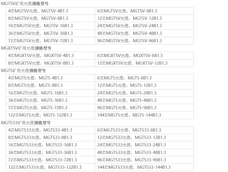 煤矿用光缆有很多种型号,结构有中心束管式结构和层绞式结构,矿用光缆是铠装光缆,有钢铠装和钢丝铠装两种。MGTS33矿用光缆 采用松套层绞式结构,光纤套入由高模量聚酯材料制成的松套管中,套管内填充防水化合物。松套管(和填充绳)围绕金属中心加强芯(磷化钢丝)绞合成紧凑的缆芯,缆芯内的缝隙充以阻水油膏。缆芯外挤制一层PE护套。护套外一圈钢丝铠装,在挤制一层蓝色PVC阻燃护套。