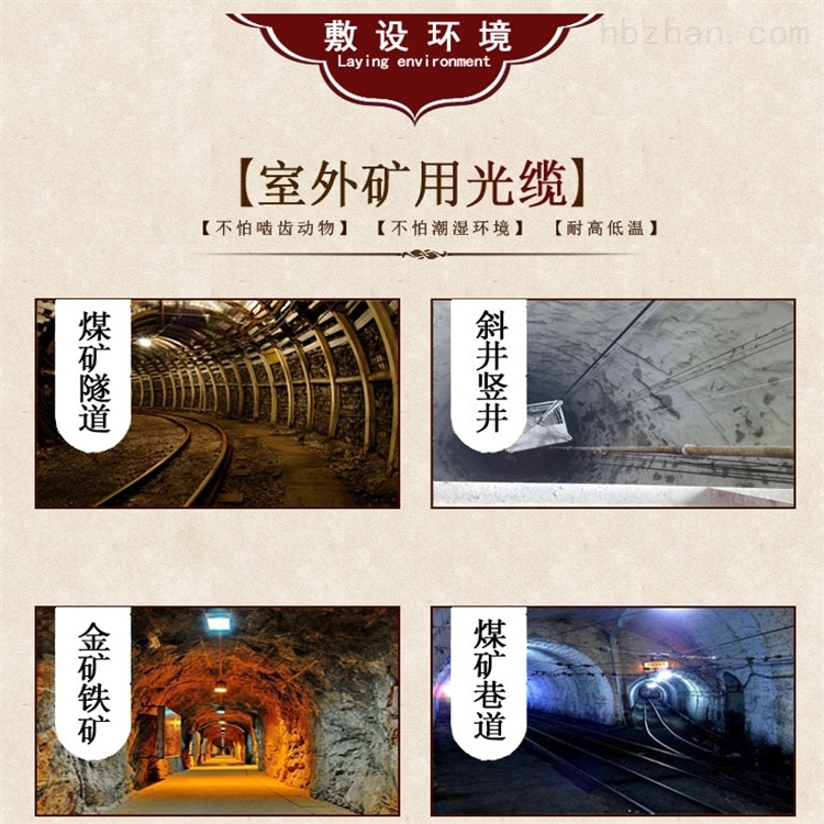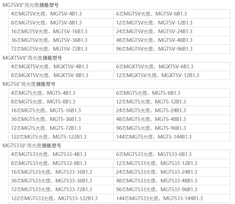 矿用阻燃光缆生产厂家MGTS33煤矿用通信光缆2-144芯主要是用于煤矿,金矿,铁矿等竖井下通信视频的传输,阻燃性能好,防砸,防压,防拉伸,耐磨损,适用于阻燃等环境。 矿用阻燃光缆生产厂家有很多种型号,结构有中心束管式结构和层绞式结构,矿用光缆是铠装光缆,有钢铠装和钢丝铠装两种。MGTS33矿用光缆 采用松套层绞式结构,光纤套入由高模量聚酯材料制成的松套管中,套管内填充防水化合物。松套管(和填充绳)围绕金属中心加强芯(磷化钢丝)绞合成紧凑的缆芯,缆芯内的缝隙充以阻水油膏。缆芯外挤制一层PE护套。护套外一圈钢丝铠装,在挤制一层蓝色PVC阻燃护套。 执行标准MT/T 386-2011 Q/TY1009-2020 煤矿用通信光缆型号及其名称 MGTS:金属加强构件、松套层绞填充式、钢—聚乙烯粘结护层、阻燃聚烯烃外护套煤矿用通信光缆。 MGTSV:金属加强构件、松套层绞填充式、钢—聚乙烯粘结护层、阻燃聚氯乙烯外护套煤矿用通信光缆。 MGXTSV:中心管填充式、金属加强构件、钢—聚乙烯粘结护层、阻燃聚氯乙烯护套煤矿用通信光缆 MGTS33:煤矿用金属加强构件、松套层绞填充式、钢-聚乙烯粘结护套、钢丝铠装、阻燃聚烯烃护套通信光缆