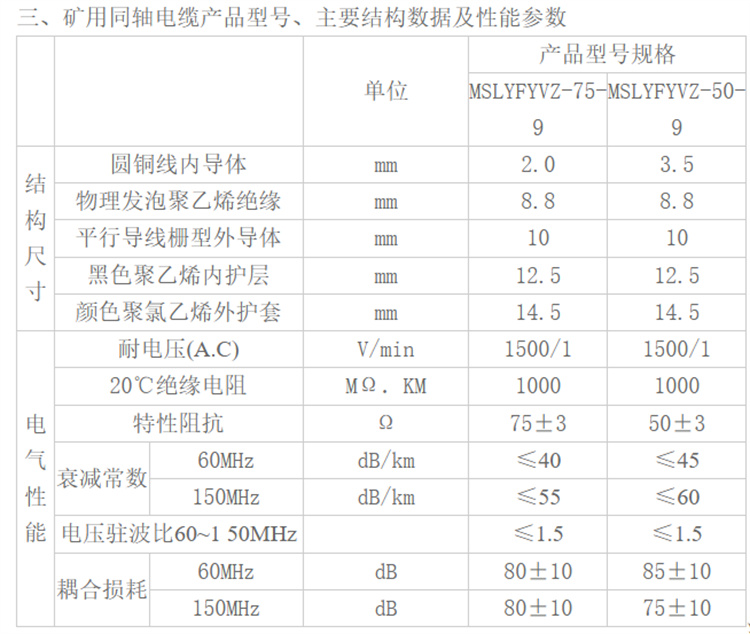 二、MSLYFYVZ-75-9矿用同轴电缆主要技术特性