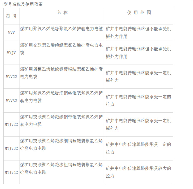 矿用电力电缆MYJV22用途:煤矿用额定电压1KV及以下固定敷设用电缆,适用于煤矿井下的电力传输。